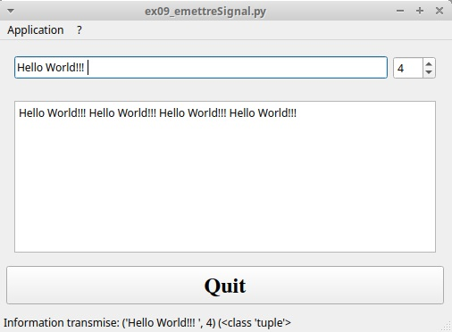 Après Du widget au mainwindow, cet exemple montre comment créer son propre signal personnalisé et l'utiliser pour transmettre une information entre différents objets Qt.