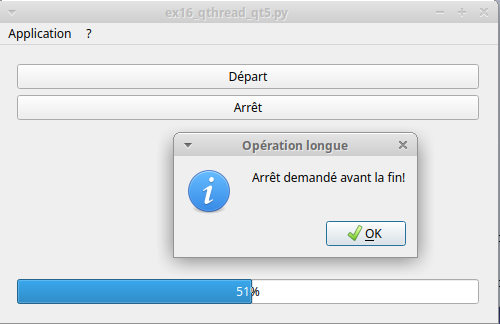 Le but est de déléguer un travail à un QThread ce qui laisse alors la boucle de traitement des évènements Qt libre pour faire autre chose (ici afficher une barre de progression en fonction de l'avancée du travail).