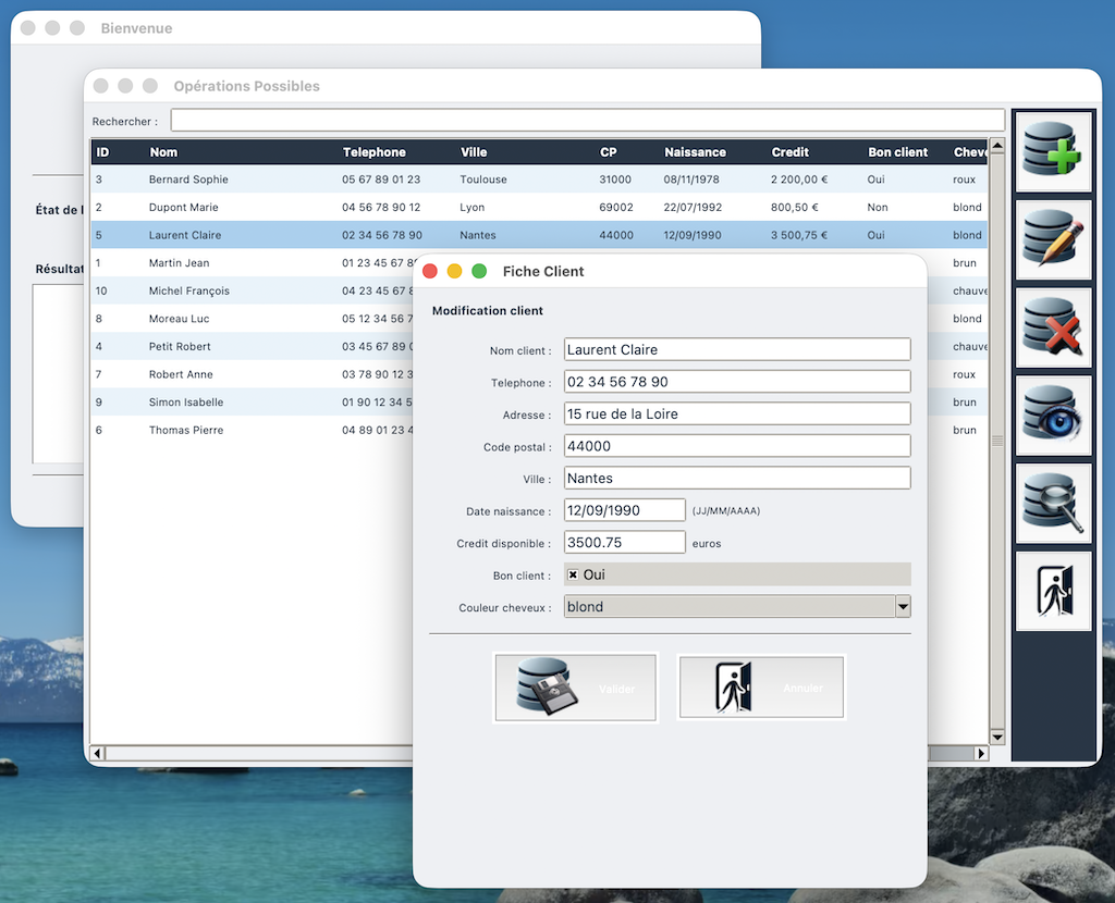 Il gère les opérations principales sur une table Clients dans une base SQLite : recherche, création, modification, suppression et sélection d'enregistrements.